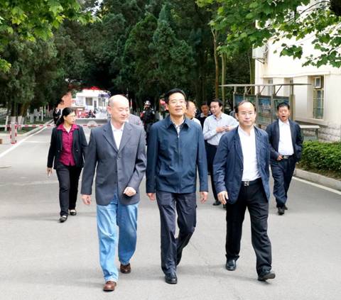 安顺市委常委、市委秘书长、市委统战部部长尹恒斌(中)在安顺学院党委书记罗荣彬(右)、院长刘雷(左)、党委副书记陶文彩(后右)等陪同下考察校园。